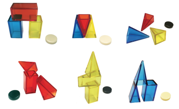 The new Zendo still has Pyramids, since pyramids are so cool, but they are joined by Blocks and Wedges, all in just one size. The pieces are made of the same beautiful clear plastic as our pyramids, in three vivid colors, with plenty of each type to build Structures with.